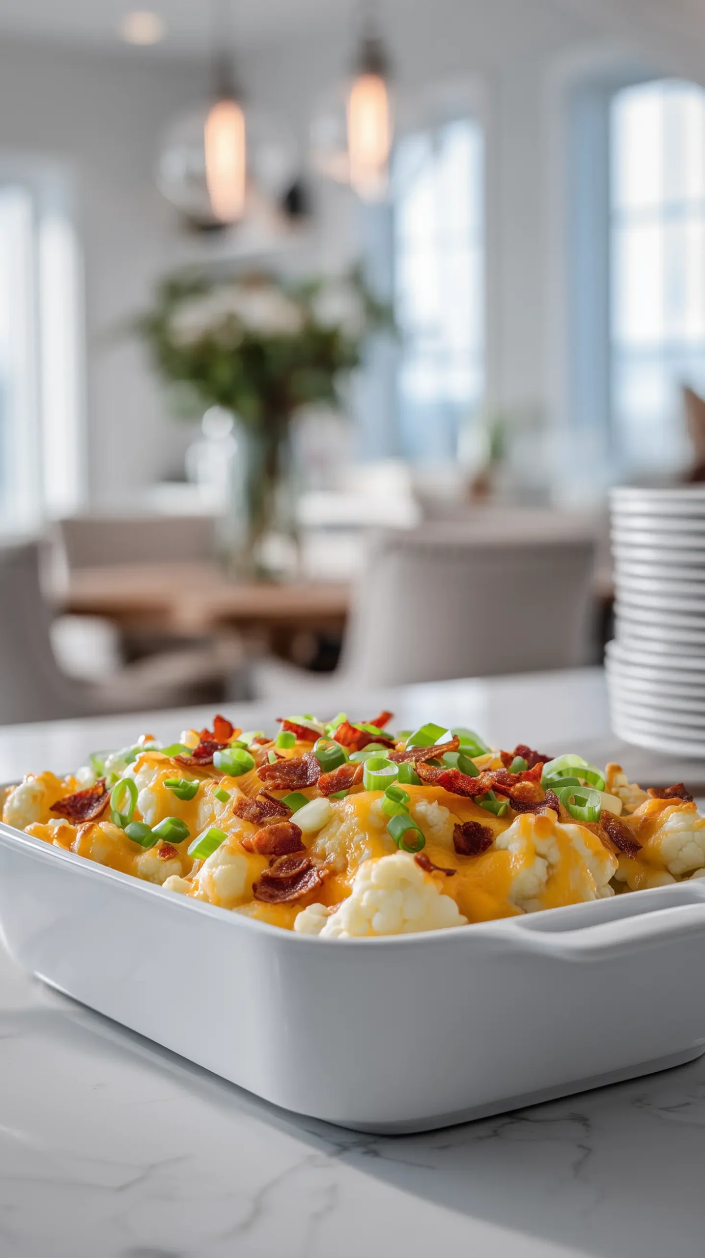 It has all the cozy, creamy, cheesy flavor of a loaded baked potato casserole, but the cauliflower keeps it lighter while remaining hearty and satisfying.